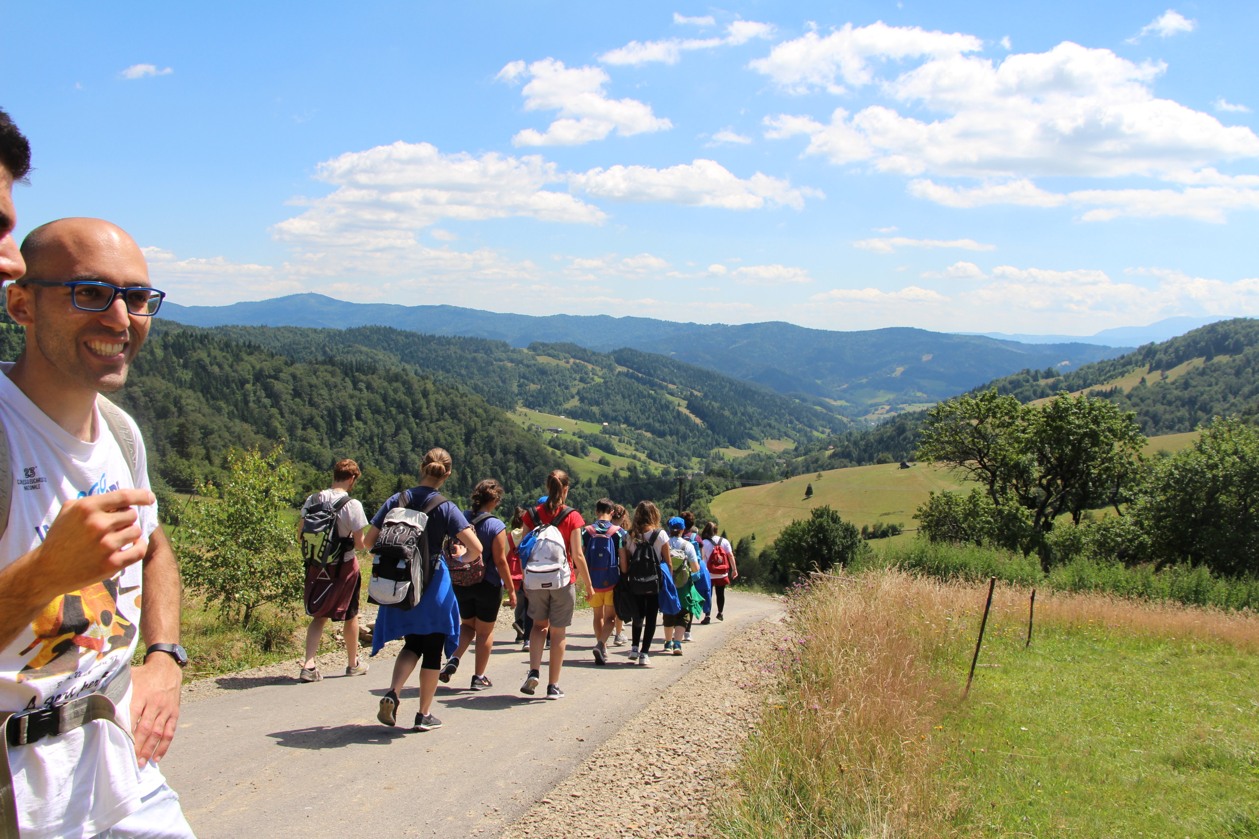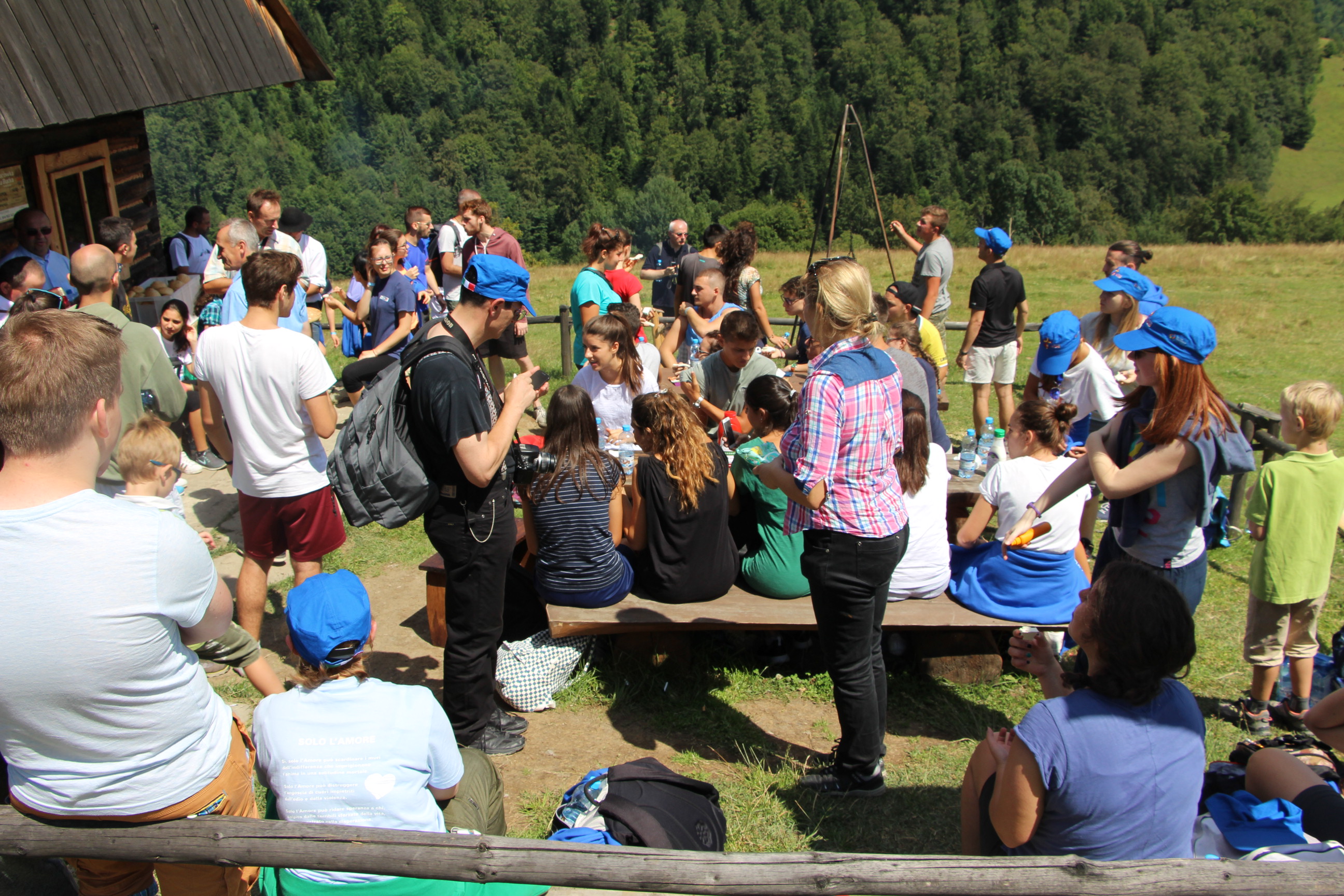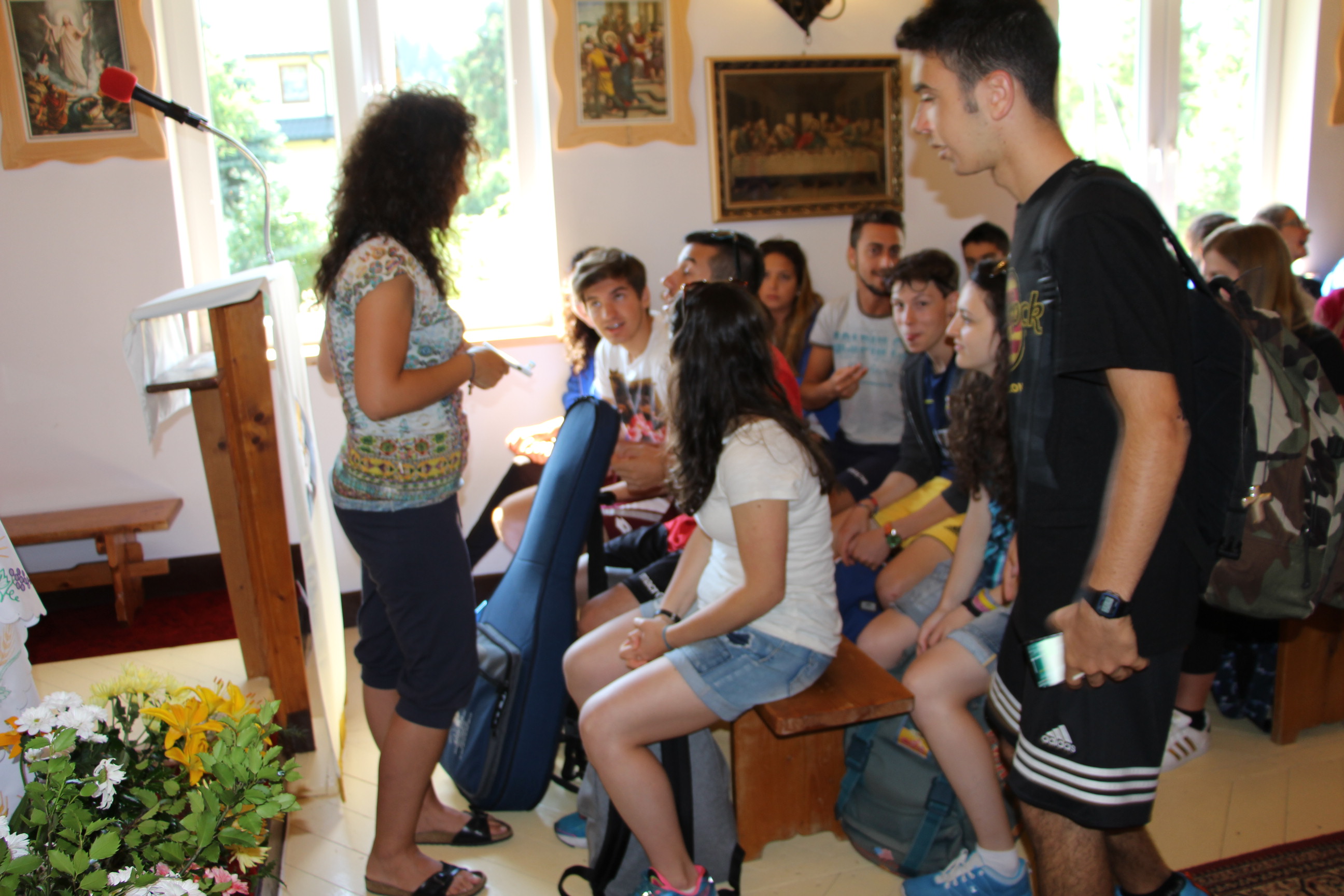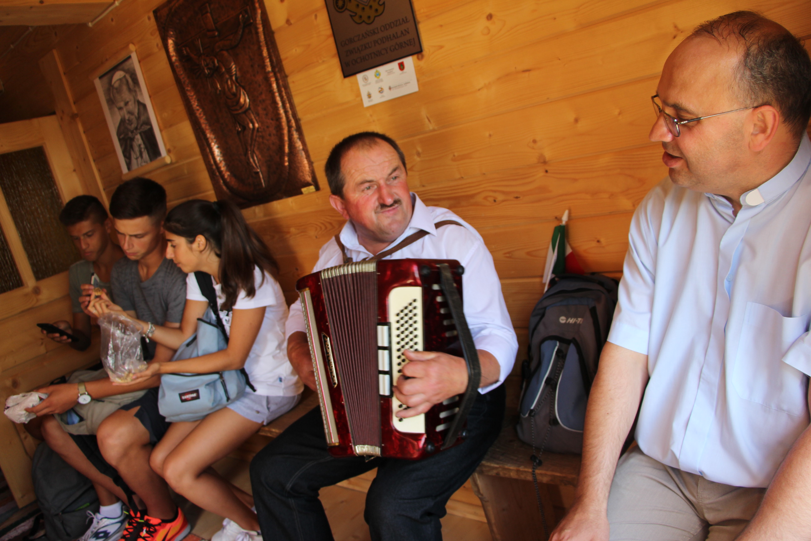 Wraz z grupą z Ochotnicy Dolnej przeżyliśmy czwartek 21.07. jako dzień turystyczny. Rozpoczęliśmy go w  kaplicy w Jamnem od polsko-włoskiej Mszy świętej,  którą koncelebrowali dwaj włoscy księża, ksiądz proboszcz Stanisław Kowalik i wikariusze: ks. Paweł Kita i ks. Paweł Łebski. W czasie liturgii nie zabrakło śpiewów przygotowanych przez naszą scholę,  gości z Włoch i p. Ludwika Czajkę. Następnie pieszo udaliśmy się na Skałkę, by na własnych nogach podążać szlakiem Jana Pawła II, który przed 60. laty gościł w Ochotnicy na obozie narciarskim. Wyprawie do Wojtyłowej Gazdówki przewodniczył p. Zdzisław Błachut, który oprowadził wszystkich po wnętrzu i zapoznał z historią miejsca. Następnie przeszliśmy pod bacówkę u Jarka Buczka, który wraz z żoną przygotował dla nas gościnne przyjęcie i poczęstunek złożony z regionalnych wyrobów. Była to też okazja do poznania specyfiki pracy na bacówce i przyjrzenia się z bliska hodowli owiec. Mimo wielu wrażeń, młodzieży nie brakowało energii do wspólnej zabawy na świeżym powietrzu, a całości towarzyszyła góralska muzyka w wykonaniu p. Ludwika. Nieoceniona okazała się także pomoc  p. Janiny i p. Leszka którzy niestrudzenie towarzyszyli nam w każdej wyprawie jako tłumacze. Po trudach wędrowania zeszliśmy do centrum, gdzie w Wiejskim Ośrodku Kultury czekało nas zwiedzanie – pod okiem kierownika – muzeum regionalnego i lotniczego.  Sprawdziliśmy też swoją wiedzę w quizie polsko-włoskim przygotowanym przez p. Teresę i młodzież. Drobne nagrody i zabawne odpowiedzi wywołały mnóstwo radości. Po poczęstunku przygotowanym w WOK-u wraz z KGW, młodzież dała się porwać do wspólnej zabawy przy tańcach integracyjnych i muzyce zespołu Halni. Nie zabrakło także czasu na modlitwę i zapoznanie się  z sylwetkami polskich świętych i błogosławionych.