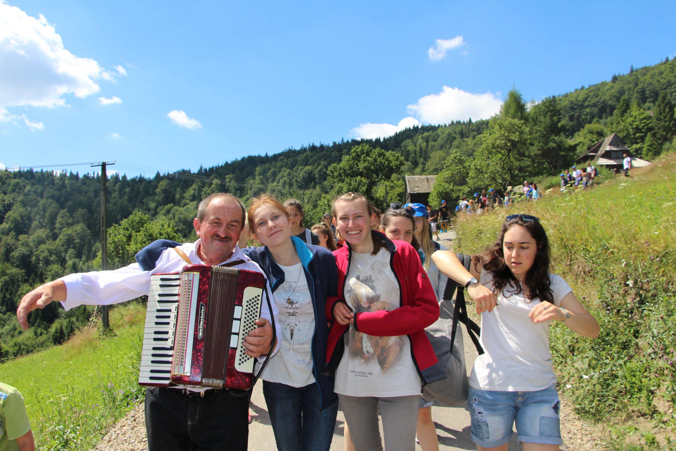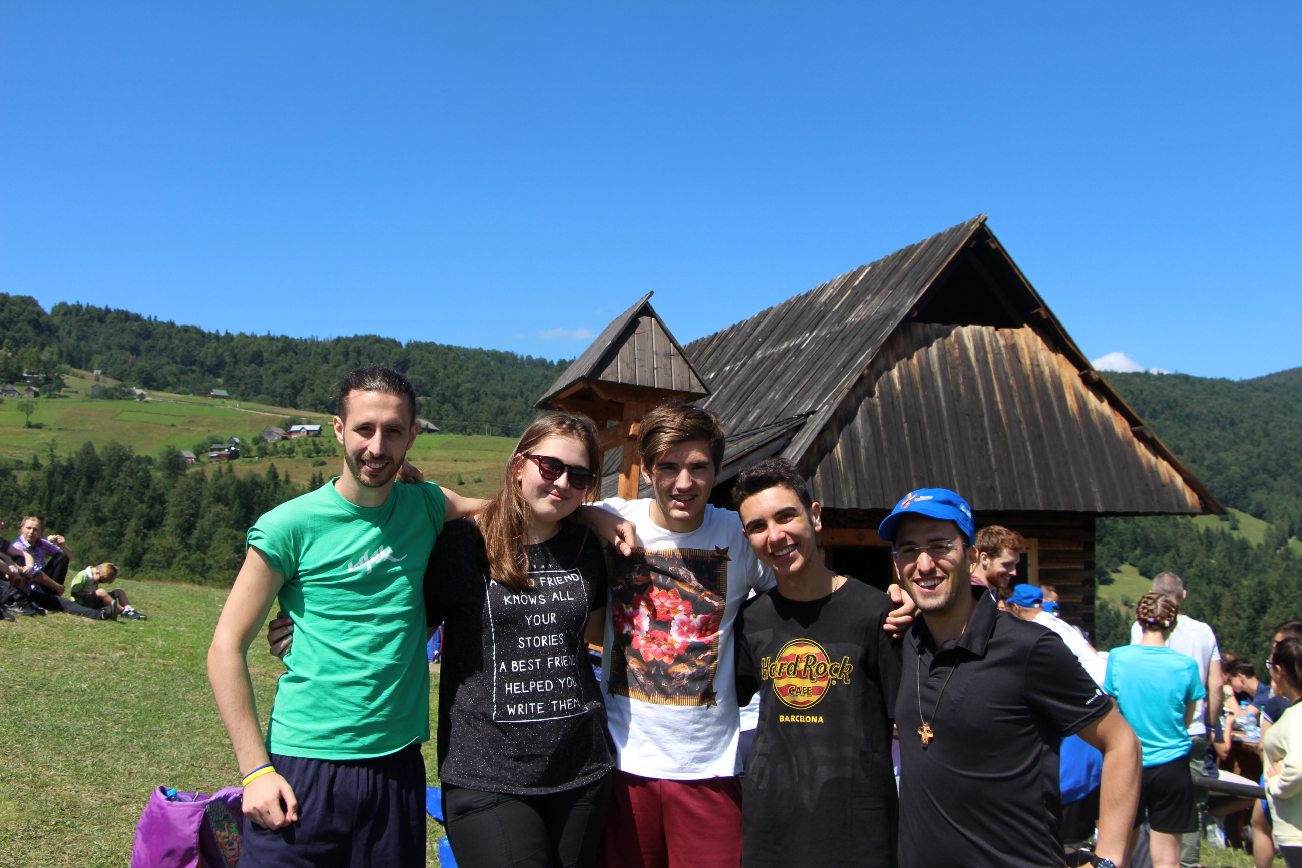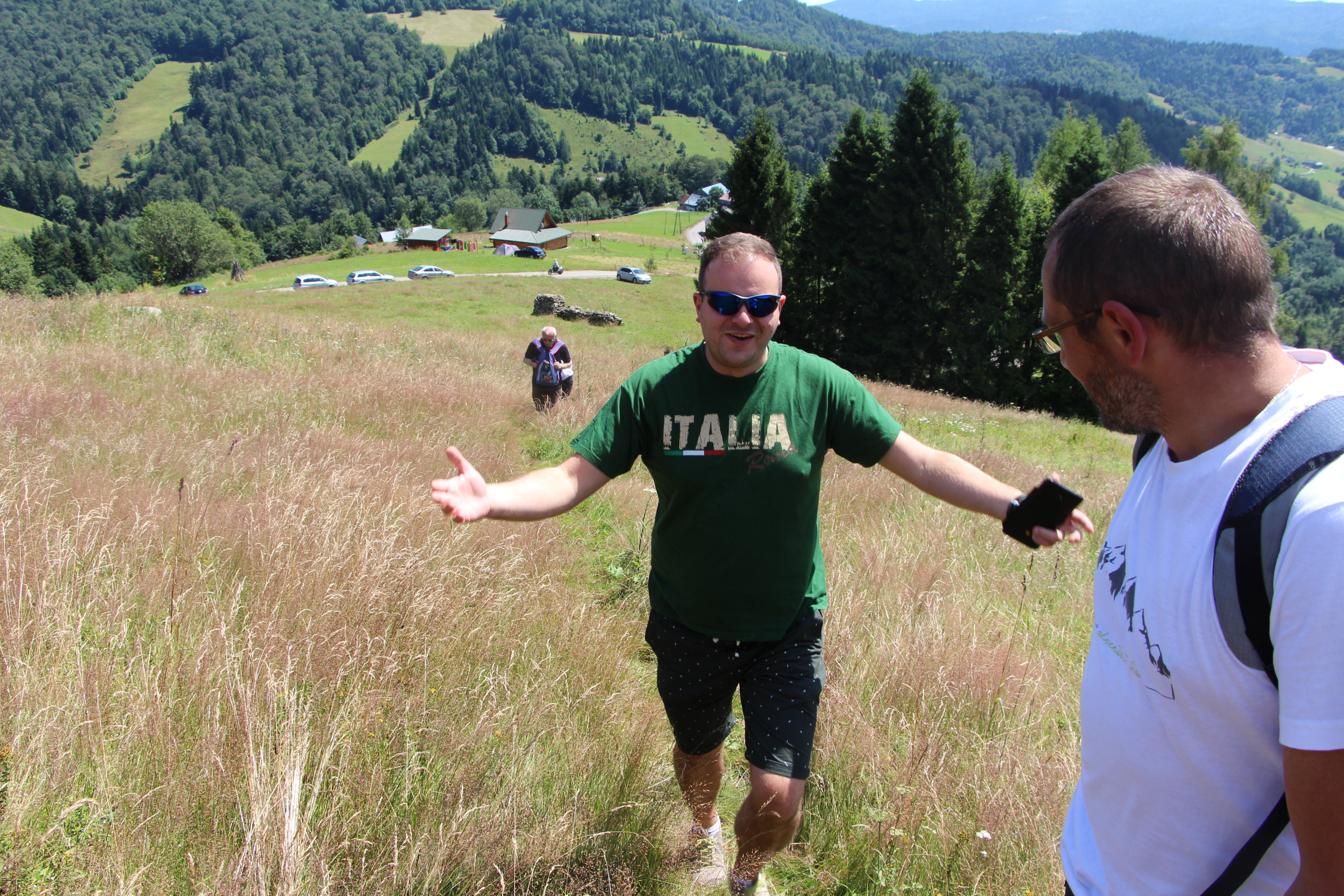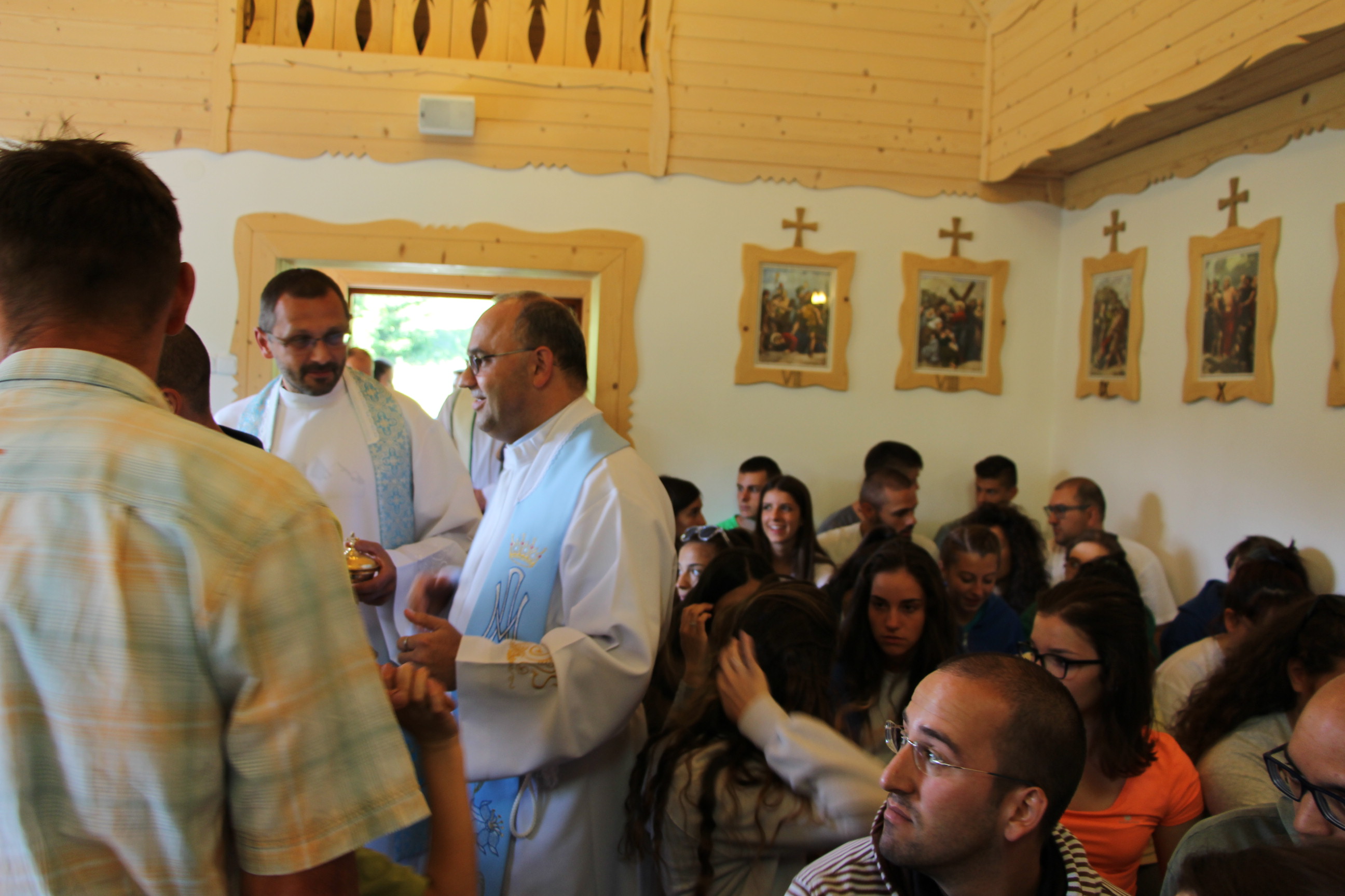 Wraz z grupą z Ochotnicy Dolnej przeżyliśmy czwartek 21.07. jako dzień turystyczny. Rozpoczęliśmy go w  kaplicy w Jamnem od polsko-włoskiej Mszy świętej,  którą koncelebrowali dwaj włoscy księża, ksiądz proboszcz Stanisław Kowalik i wikariusze: ks. Paweł Kita i ks. Paweł Łebski. W czasie liturgii nie zabrakło śpiewów przygotowanych przez naszą scholę,  gości z Włoch i p. Ludwika Czajkę. Następnie pieszo udaliśmy się na Skałkę, by na własnych nogach podążać szlakiem Jana Pawła II, który przed 60. laty gościł w Ochotnicy na obozie narciarskim. Wyprawie do Wojtyłowej Gazdówki przewodniczył p. Zdzisław Błachut, który oprowadził wszystkich po wnętrzu i zapoznał z historią miejsca. Następnie przeszliśmy pod bacówkę u Jarka Buczka, który wraz z żoną przygotował dla nas gościnne przyjęcie i poczęstunek złożony z regionalnych wyrobów. Była to też okazja do poznania specyfiki pracy na bacówce i przyjrzenia się z bliska hodowli owiec. Mimo wielu wrażeń, młodzieży nie brakowało energii do wspólnej zabawy na świeżym powietrzu, a całości towarzyszyła góralska muzyka w wykonaniu p. Ludwika. Nieoceniona okazała się także pomoc  p. Janiny i p. Leszka którzy niestrudzenie towarzyszyli nam w każdej wyprawie jako tłumacze. Po trudach wędrowania zeszliśmy do centrum, gdzie w Wiejskim Ośrodku Kultury czekało nas zwiedzanie – pod okiem kierownika – muzeum regionalnego i lotniczego.  Sprawdziliśmy też swoją wiedzę w quizie polsko-włoskim przygotowanym przez p. Teresę i młodzież. Drobne nagrody i zabawne odpowiedzi wywołały mnóstwo radości. Po poczęstunku przygotowanym w WOK-u wraz z KGW, młodzież dała się porwać do wspólnej zabawy przy tańcach integracyjnych i muzyce zespołu Halni. Nie zabrakło także czasu na modlitwę i zapoznanie się  z sylwetkami polskich świętych i błogosławionych.